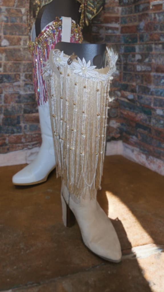 Glowing with soft shimmer and sunset vibes — Golden Hour features ultra-long fringe with gold beads, pearl strands, and delicate floral trim. This set brings effortless Western elegance to any pair of boots.