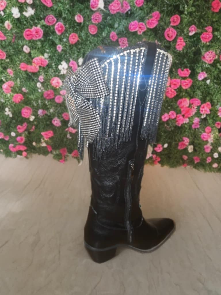 Turn up the drama with Midnight Rodeo — a bold black fringe design lined with sparkling rhinestones. Add the optional embellished bow for even more after-dark glam. Whether you're heading to a honky-tonk or a night concert, this set brings the heat.