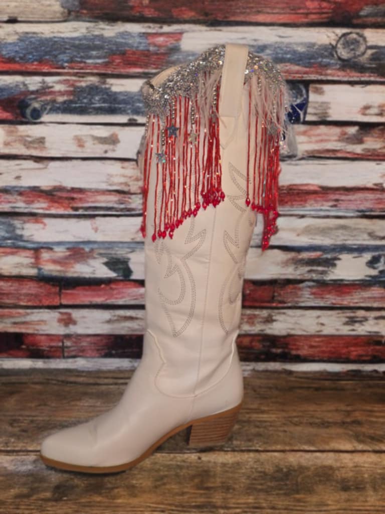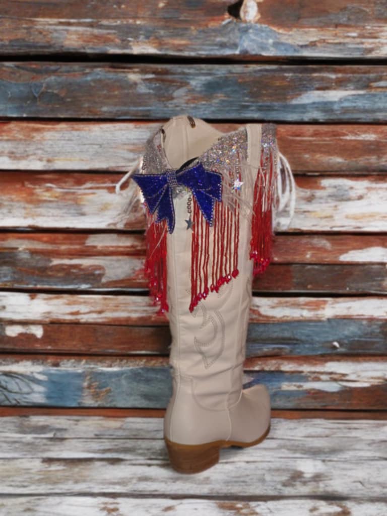 Inspired by the patriotic anthem, Only in America delivers red-hot fringe, silver sparkle, and a bold blue bow — all clipped onto your boots with star-spangled flair. Perfect for parades, fireworks, concerts, or anytime you’re feelin’ proud and free.