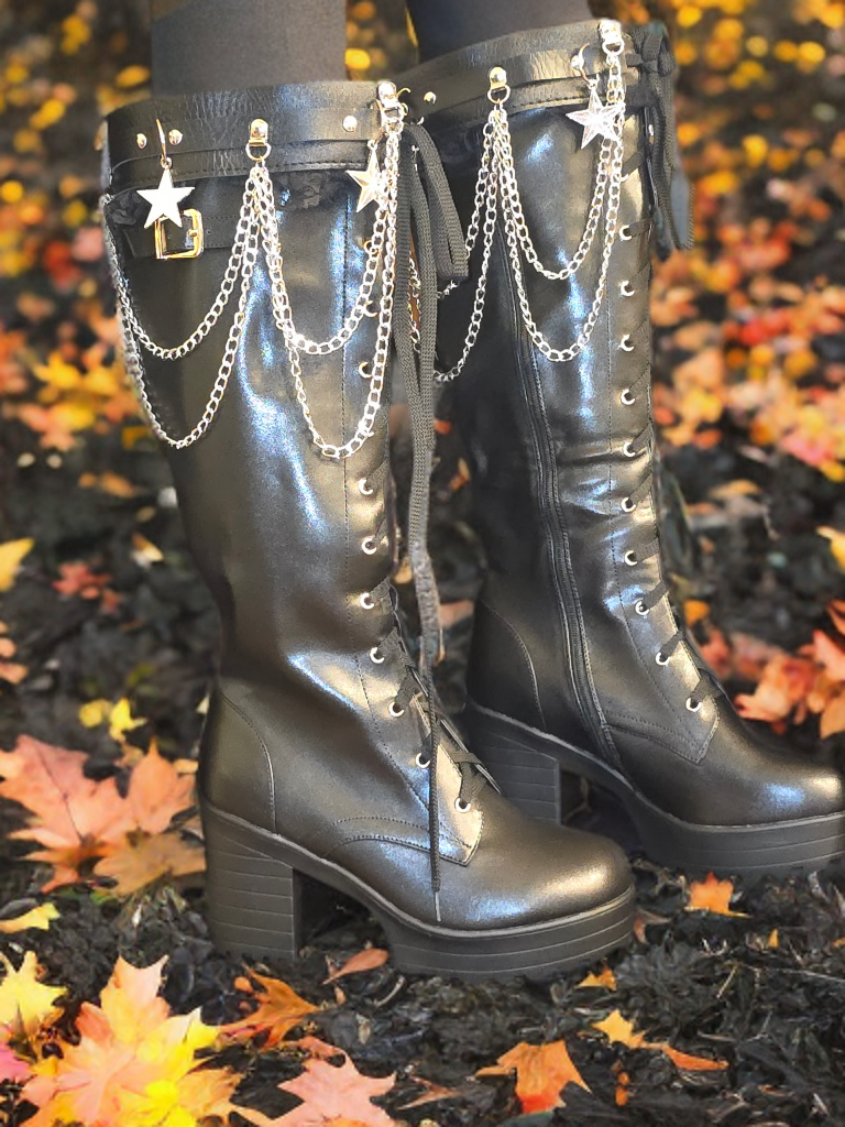 Inspired by punk princess and rock icon Debbie Harry, The Blondie Bling Babe set turns any boot into a bold fashion statement. Featuring a slick black pleather band adorned with silver star embellishments, draping chains, and black lace detailing, this set blends rebellious edge with just the right amount of sparkle. Whether you're hitting the stage, the street, or a late-night dive bar, these toppers say you're here to shine — on your own terms.