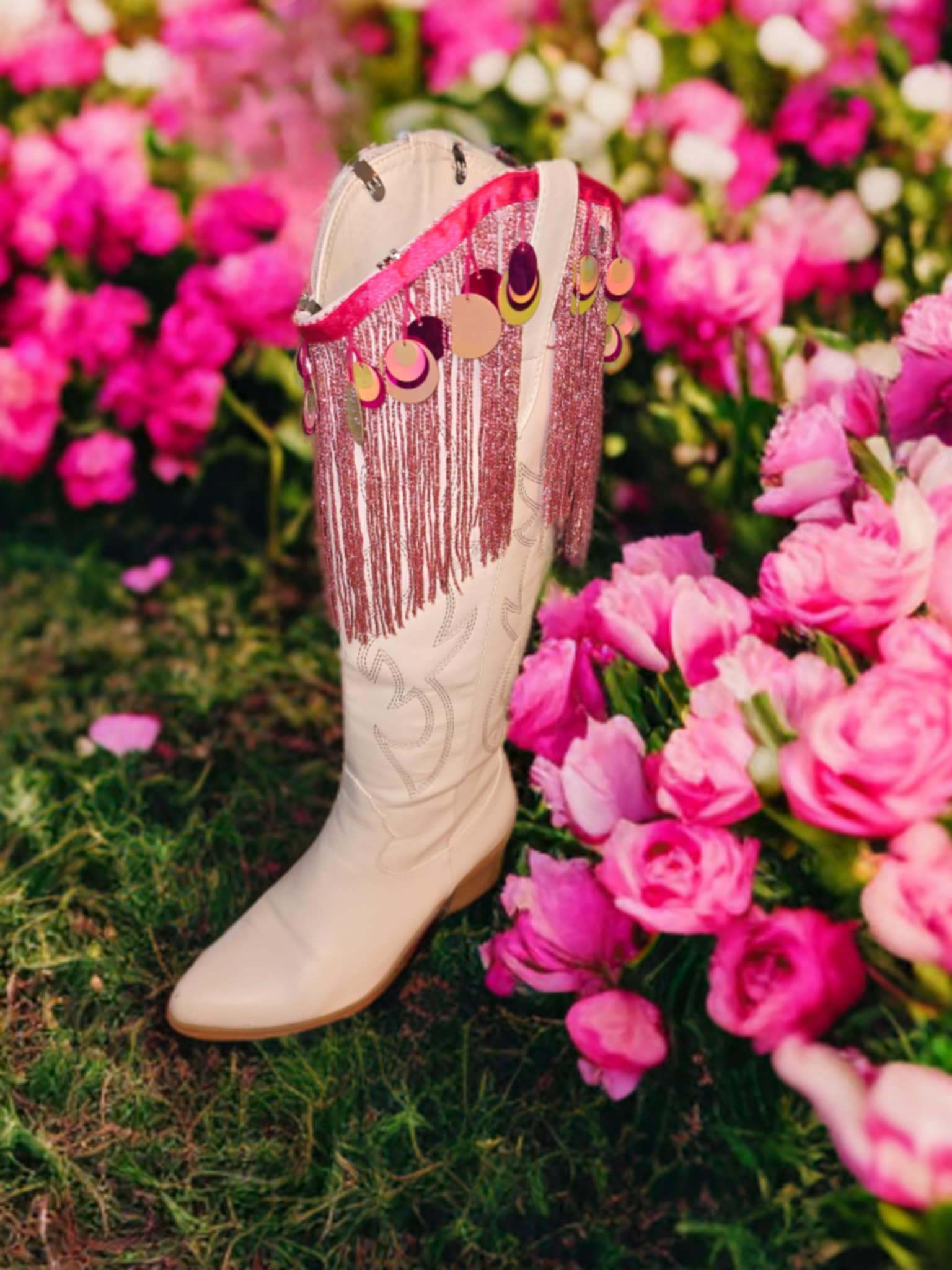Pretty in pink with a whole lotta sass — The Dolly brings the glam with bold confetti discs and shimmering fringe. This patent-pending clip-on accessory instantly transforms your boots into a showpiece. Perfect for concerts, girls’ nights, or anytime you want to stand out.