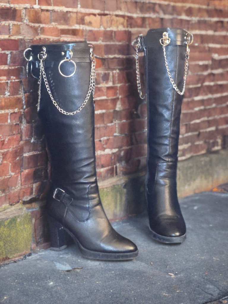 The Gemma features a bold black pleather base, layered in attitude with heavy silver chains and metallic rings that dangle and drape over the shaft like biker battle armor. It’s gritty, glam, and unapologetically badass — perfect for leather, denim, or your most rebellious fringe. Whether you're walking into a concert or out of a standoff, The Gemma lets them know: you're not to be messed with.